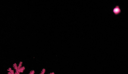 Fig: 6. This rather strange looking invisible form, that almost resembles a small winged being, was captured just above the treetops at my research area near Oxford on June 21st 2016 at 9:46pm. The 1/60th second exposure was taken using an infrared converted Canon G10 (with flash), and was one of well over a dozen photographs taken in quick succession after a spate of Geiger counter alerts. Multiple shots were taken of the area just above the trees, but the object only appeared in the one photograph. In each case the camera's white balance was set to automatic, giving the photographs a slight reddish tint, due to the camera's sensors leaning towards the visible red that occurs just before the infrared.